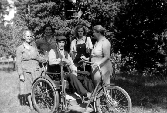 Bildtext: Äntligen hemma i Haga, Enånger. Efter IOGT-resa den 10-18 juli 1959. Med uppträdanden på Liseberg i Göteborg (se bild: bewsod-42) med flera platser i landet. på bilden syns Ulla och Anita Söderholm, Vivianne Borin samt okända