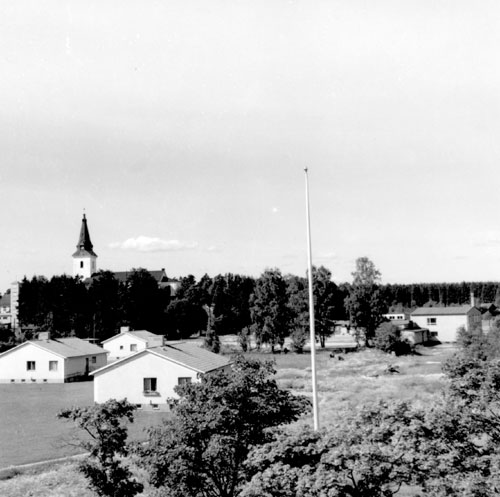 Bildtext: tre nybyggda lärarbostäder på Härje (Bro), ytterligare två byggdes något senare, till höger den nybyggda kyrkskolan.