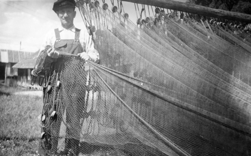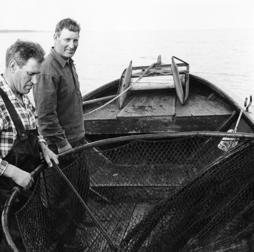 Bildtext: Strömmingsskötarna läggs ut. Mannen med rutig skjorta är Gunnar Eriksson ,Fjäle och pojken är hans son, troligen Bror. Mannen med keps Per Eriksson, Fjäle. Båten sannolikt byggd av bröderna Erikssons i Fjäle