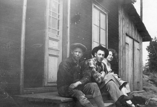 Bildtext: flygbild över Bro med gamla kyrkan i centrum. Sundins Café o bageri nere till höger, notera brödbutiken höger om entrén. Poststämplat 1957