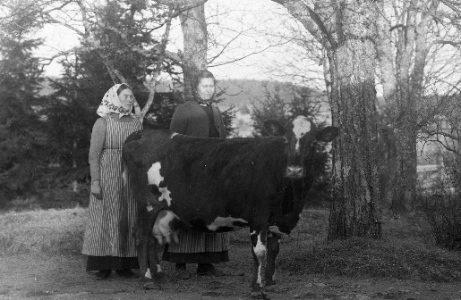 två okända kvinnor med en ko i en okänd miljö