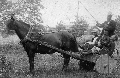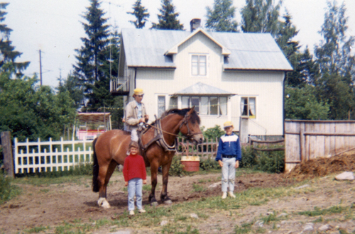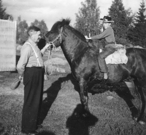 Bild från Arthur Sättlins i Finnika. På hästen sitter Bruno och Kerstin Svenson. Han som håller hästern är Stig Sättlin. Pojkarna kanske Bengt och Erik