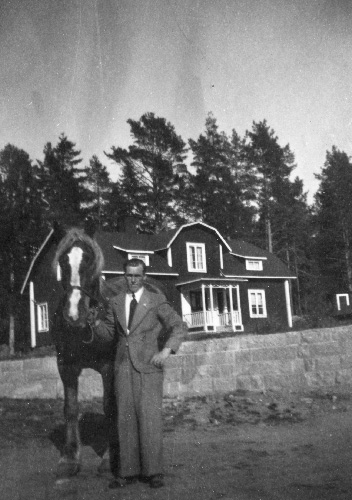 okänd man med häst framför huset i Grimbo som ägdes av Bricken Wallin, senast av Arvid Nordin. Huset och stenmuren revs omkring år 2000 i samband med nya järnvägsbygget. Jämför bild nr: ied-93