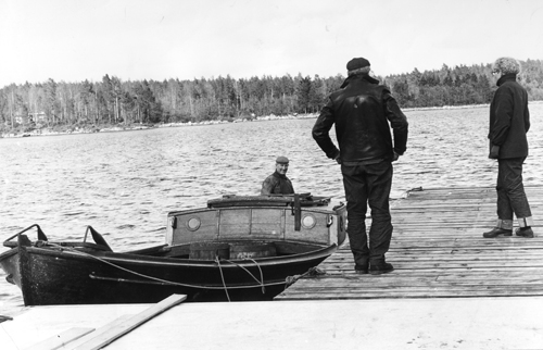 Bildtext: Två av bröderna Eriksson på Karskär, på väg med strömmingsskötarna för torkning. Fv. Gunnar o Per