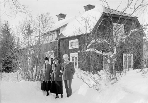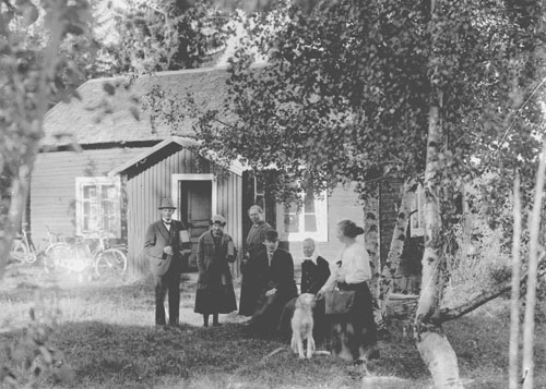 Bildtext: En okänd byggnad, i förgrunden sex personer samt en hund. Från vänster: okänd, Stina Jonsson, Viktoria Ström, Kalle Karlsson, okänd, Enny Jonsson