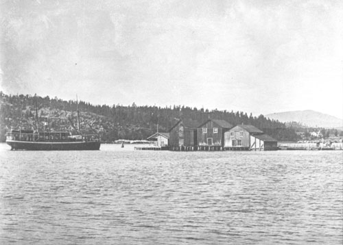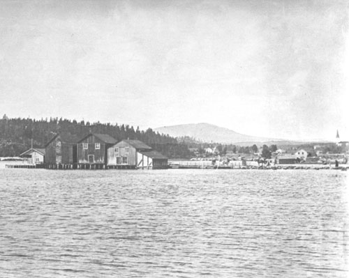 Sökord: vy, sjöbodar, bro, ångbåt, brygga, hamn