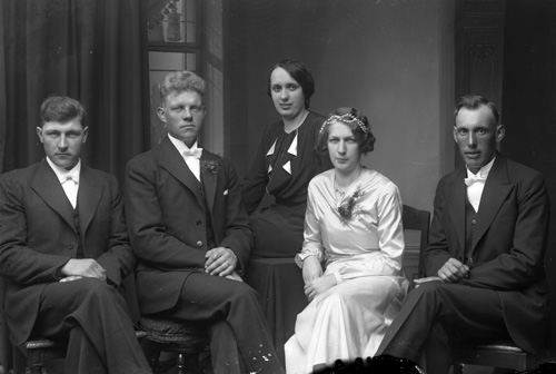 Brudparet är Elsa Ståby Nora. Sigurd Wahlström Långvind. Till vänster (?) en bror t Sigurd. I mitten Agnes Ståby Nora. Till höger Verner Ståby Nora.