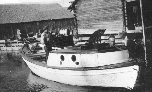 Bildtext: Från Karskärs fiskeläge. Männen är J O Englin och Erik Enbom, kvinnorna okända