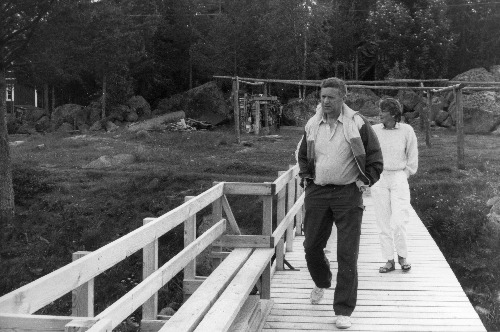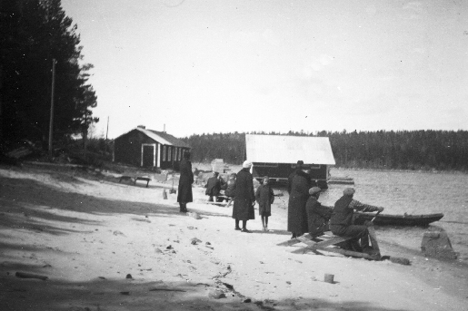 Bildtext: En grupp människor i en båt. Enligt uppgift på väg till (eller från) Borkbo fiskeläge. Plats: intill Borka brygga. Till vänster Evert Enbom med sonen Arne. Till höger Sven-Erik Enbom. Övriga namn: Lena Söderlund, Svea Östlin, Elsa Helsing, Gerd Lindfors, ? Östberg, John Sundqvist (högst upp till höger), Henny Enbom-Söderlund, Gunnar Svensk
