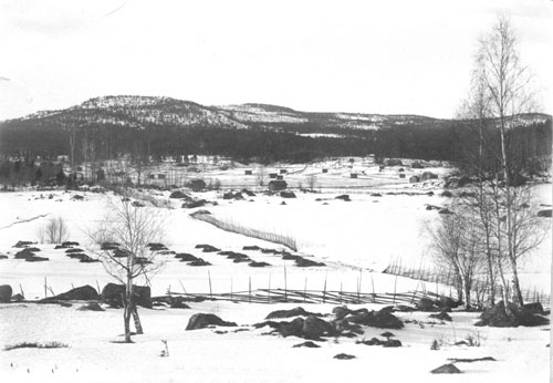 Bildtext: tre nybyggda lärarbostäder på Härje (Bro), ytterligare två byggdes något senare, till höger den nybyggda kyrkskolan.