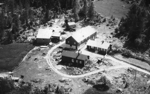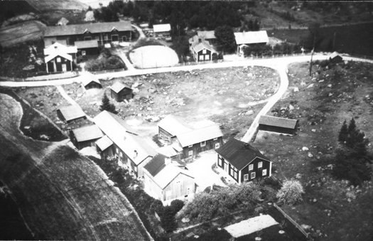 Bildtext: Flygfoto, Hålsänge. Hemmanet söder om byvägen var Hans Erik Bergmans, Hålsänge 2:5, sonen Johan tog över och man rev en bostad som var hopbyggd med ladugårdslängan. 1949-1950 byggde han ett nytt fristående hus med källarvåning där. Det mörka bostadshuset t.h. revs på 1960-talet. Hemmanet Hålsänge ss 2. Nott om byvägen lät Hans Eriks far Lars Hansson-Bergman bygga och stycka av till sin dotter Karin "Kalla" Bergman. Kallas dotter Karin gifter sig 1913 med Axel Edström från Mekrossla. Han blev måg och bonde i Hålsänge ss2. (2:7). De fick fyra barn, och sonen Olle blir ägare till stället, gifter sig 1946 med Anna f Borin från Svedja. Deras son Carl-Åke f 1947 blir ägare men bor på annan ort. De sista årtiondena har det varit ytterligare tre ägare på stället. Det lilla huset inne på gården var troligen en snickarbod som revs på 1960-talet. (Namnet var Lass-Hanns Olles). På norra sidan alldeles efter byvägen står skolans lärarbostad, men revs på 1960-talet. Skolhuset och utedasset med vedbod stor kvar än idag 2017. Spruthuset t.h. står på södra sidan vägen med flyttades på 1960-talet till norra sidan om vägen. Hemmanet Hålsänge 2:5 som Johans son Sigvard Bergman har ägt och bott på i många år, har nu (2015) bytt ägare till bonden Lars Nordlund i Fläcka