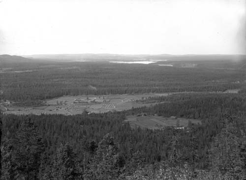 Bildtext: Utsikt från Bäckmoraåsen över Bäckmora. Jon-Pärs gård i centrum, nuvarande: Göran o Agneta Persson. Strax nedanför skymtar "Mattsons", nuvarande Mats Persson. Gården på bild brann, troligen på 1930-talet och återuppbyggdes 1947. Gläntan nedanför kallas Bäcklins, där även Per-Massas skymtar. Se även detaljförstoring. Sök på sökbegrepp en-m-148b