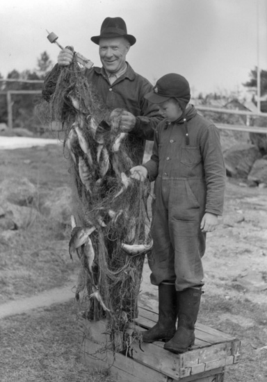 Bildtext: Erik Vilhelm Bergman f 1882 från Borka, fiskare på Agön då man rodde o seglade båtarna. Flyttade till Borkbo 1923 i och med att en sjöbod på Agön revs och flyttades till Borkbo. Sonen Oskar Bergman f 1917 och hustrun Vanda f Andersson 1919 tog över fisket. De fiskade strömming tiden 1940-1960-talen som förädlades, bl.a. lökströmming enligt bild. Rökeri byggdes även, röker "prima böckling". Inläggning och paketering skedde i villan i Borka. Anna Svedin jobbade också där. Produkterna skickades via järnväg, och mycket gick till Dalarna. Oskar slutade fiska 1964 men fortsatte några år till med förädlingen, köpte då strömming av Gävle fisk. Burkarna köptes genom handlare Franck, en gång köptes en hel järnvägsvagn med burkar för två öre st. Idag, år 2019, äger sonen Åke (f 1951) sjöboden på Borkbo. Numera ombyggt. Fiskekuttern finns kvar, en Erik Bergkvist båt