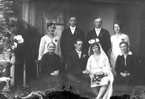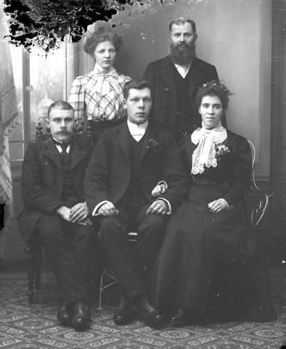 Bildtext: Olov Westlings 50-års dag. Från vänster: Karl Westling med fru Karin född Lindfors, Elin Westling gift Munter, Axel Westling med fru Karin född Hållén, Gunnar Westling, Hanna Westling gift Johansson, Märta Westling gift Brolin, Erik Westling, Hjalmar Westling, Olov Westling, Frida Westling född Svedin, Anny Westling gift Enberg, Gustav Westling,Einar Westling - son till Karl & Karin, Majvor Händel - dotter till Hanna, Allan Westling son till Axel & Karin