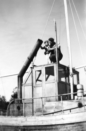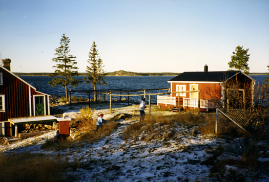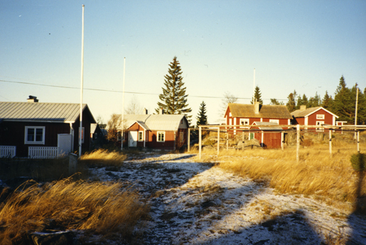 Bildtext: två okända kvinnor sysselsatt med strömmingsskötar på tork vid gistvallen. Osäker plats, kan vara Våtnäs. Vem vet mer? Kvinnan till höger kan vara Elin Gustavsson. Platsen Våtnäs är nog klarlagd. En uppgift talar om att den ena heter Sanna (okänt efternamn) och den andra Broberg utan angivet förnamn