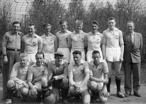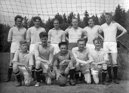 Enångers B-lag i fotboll, Vedmoraplanen. Överst f.v: Helmer Enberg, Arne Vestling, Einar Westberg, Evert Sjödin, Bror Johansson, Arvid Larsson. Nedre rad: Göran Zetterlund, Lasse Burman, Gösta Sjödin, Axel Larsson, Sune Baggström