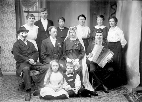 Bildtext: Ateljékort, Pastor Karl Ekholm med läsflickor. Sittande: Dahlgren från Djuprå, Anna Svedin från Holmen, Emma Brolin från Brännmo, Anna Jonson från Änga, Hilda Holm från Grängsjö (m.fl)