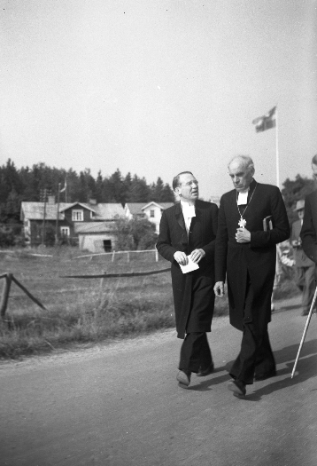 Bildtext: Skolkort, Kyrkskolan. Överst lärarinna Hedvig Hallberg. Övre rad fv: Britta Lindblom, Anny Sättlin, Berta Wedin, Ann-Marie Lindstedt (Englin), möjl Ingrid Viklund, Ingrid Persson Ådalen, Cilia Jonsson Bäckmora/Brandänge