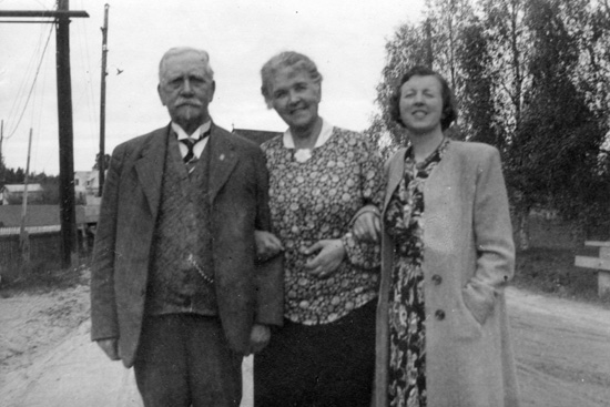Bildtext: Fv: Postmästare Broberg, hans hustru Walborg f Rosin (fotografen), Sigrid Bergstrand, syster till Maja Hedström. Platsen, landsvägen genom Enånger vid "postkroken".