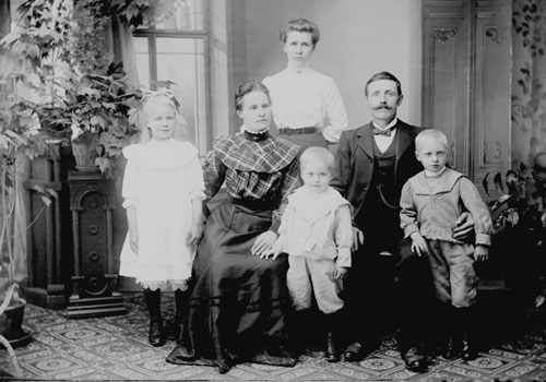 gruppfoto, Svensks i Tosätter. (främre rad f.v. Manne, Ove, Signe, Per, bakre rad: Emil, Elsa, Erik)