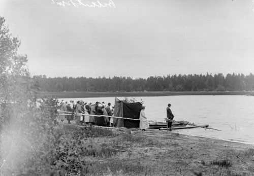 Sökord: gruppbild, sjö, människor, baptistdop, eka,