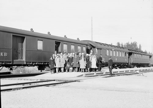 Sökord: gruppbild, järnvägsvagnar, järnväg, stins, amerikaresenärer, män, kvinnor