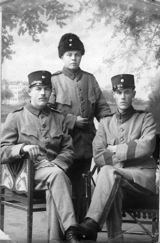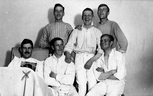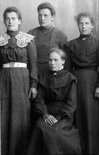 Bildtext: Från vänster nedre raden Margareta Persson, Agnes Berggren, Hilda Östberg. Från vänster mellanraden Jonas Östberg, far till Leon, Maria Johansson. Från vänster övre raden Leon Östberg, make till Hilda, Algot Johansson, make till Maria, Tycko Östberg, bror till Leon samt en okänd. Bilden tagen i samband med uppförandet av teaterpjäsen Krig.
