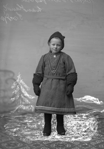 Ateljekort på vinterklädd flicka, Elsa Norèn, dotter till handlare, Svedja. Efterhandsretuschering som ger illusion av vintermotiv