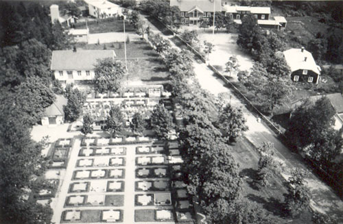 Från kyrkogården i Enånger, bortom allén skymtar nuvarande församlingshemmet (tidigare folkskola, tingshus mm)