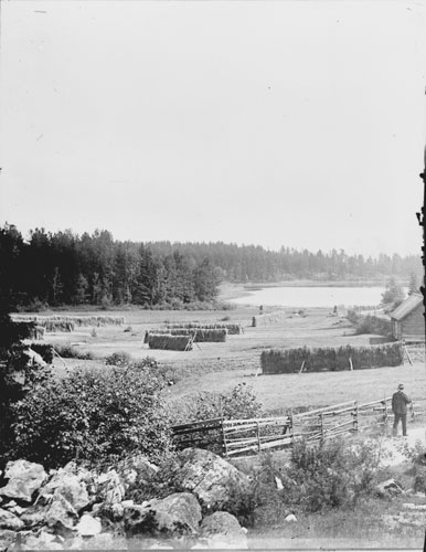 Bildtext: Ett okänt naturmotiv med sjö, åkermark, höhässjor, lada mm