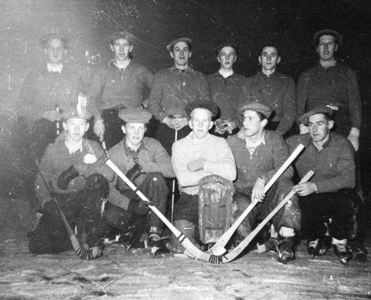 Bandylag från Enånger. Plats: Svedtjärn (Svedjatjärn). Överst fv: Evert Englin, Helge Fridlund, Ragnar Klang, Stig Brodin?, Gösta Asplund, Arvid Larsson? Främre rad: Gösta Holm, Lasse Hallberg, Sven Brodin, Nils Nilsson, Alve Melin