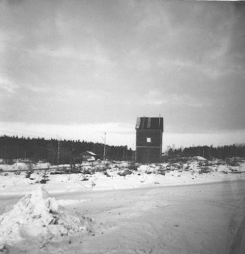 Bildtext: Byggnad med fyra personer i förgrunden. Byggnaden kallades för Kilen, och var Viktor Sundins hem, även Emma Sundin bodde där. Fastigheten har i dag adress Militärvägen 4.