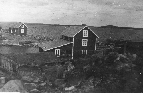 Bildtext: Bild över Enångersåns utlopp i Borkafjärden, "Packarslavan", Enångers tidiga hamnanläggning vid å-utloppet, notera sjöbodarna och timmeravlägg. Den vita gården i mitten går under benämningen Norins, nuvarande ägare Christer Andersson.