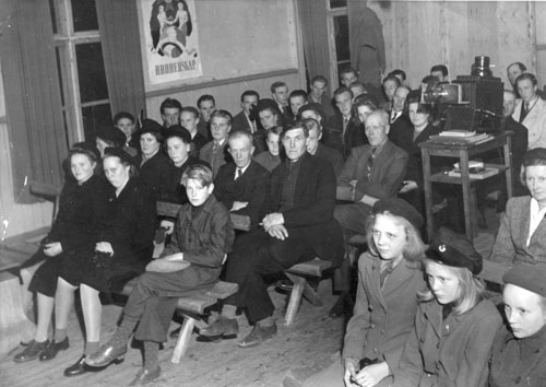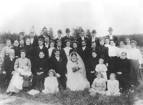 Bildtext: Från en bröllopsfest i Holmen 10/7 1910: Övre rad fv: H E Eriksson, Otto Nilsson, Gustaf Pettersson, Helmer Nilsson, Alfred Bergström, Alfred Norling, Johan Enkvist. Harald Nilsson, Andra raden: Kristina Eriksson, Stina Brosten, Olsen, Anna Melin, Klas Jungman, Gustaf Lindkvist, Anna Svensson, Per Olov Wikström, Frida Nilsson, Maja Olsson, (Olsson), Kristina Rosling, Hulda Pettersson, Cille Enbom, Anna Nilsson, Anna-Lisa Svedin, Vendla Strandberg, Kristina Östlin. Sittande: Brosten, Fanny Jungman, Lovisa Ljungman, Fritjof & Lotta Jungman, Alma Olsson, Kristina Wasberg. Barnen: Edit Ljungman, Elna Olsson, Elin Jungman, Bertil Olsson, Anna Ljungman