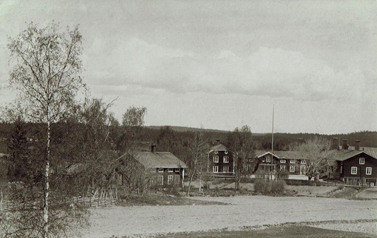 Bild över gårdarna i Hökberg, med Bodinssons gästgiveri. Fotot taget ungefär från söder, med Staffasberget till höger något utanför bild