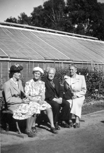 fyra personer i en okänd miljö framför något som liknar ett växthus, okänt var. Damen längst till höger är Emma Wiström från Brandänge