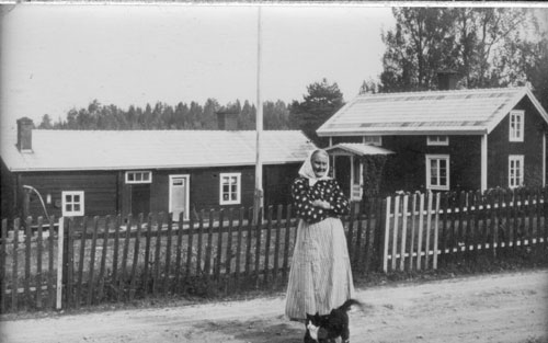 Sökord: kvinna, hus, gård, staket, katt