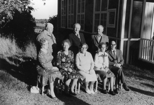 Bildtext: Överst fv Valborg Sjödin g Baggström, Nils Borin, Astrid och Verner Settlin, Per Sjödin, Albin Sjödin. Nedre rad: Marta Sjödin g Baggström, Brudparet Ester (F Sjödin) och Konrad Settlin, Karin Borin g Lindblom