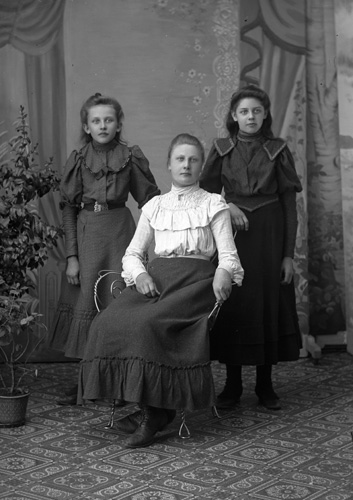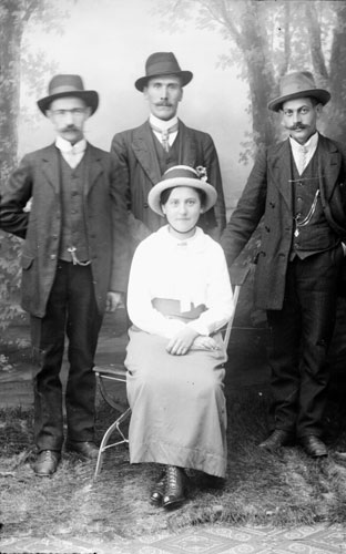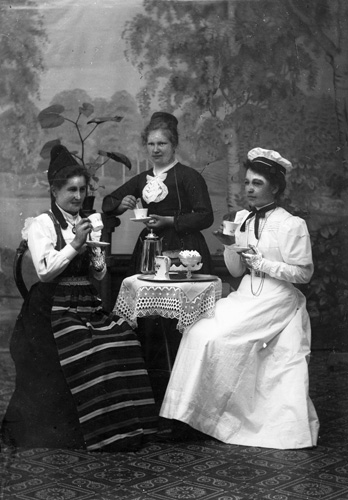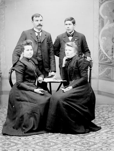 Bildtext: En grupp människor vid ett dukat bord. F.v. Signe Nordin, Tekla Svenson, Anders Svenson. Bredvid Anders Svenson sitter Anna Olsson (syster till Anders,) Axel och Lisa Olsson