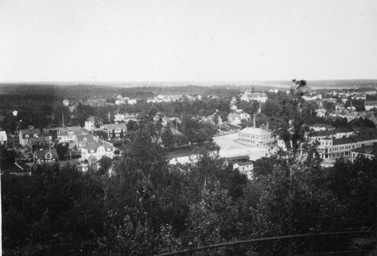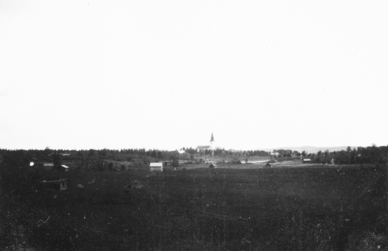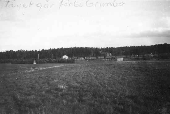 Bildtext: vy från Grimbo. Ett tågsätt passerar efter ostkustbanan