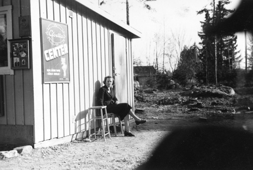 Ann-Mari Westlin sittande framför gamla kiosken i centrala Enånger
