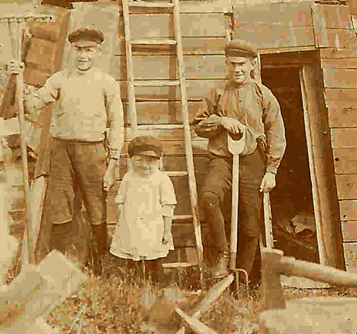 Husen i bakgrunden kan vara Olle Bergmans och Olars gård i västra Bölan. Kortet taget från "Kalvtäkta/Oppegårds"-hållet, vilket tyder på att barnen på bilden skulle kunna vara Ville och Brita Rolinder och ev deras far. Notera skjulet bakom personerna, ger intryck av en kolarkoja. Kompletterande bildinformation: Till höger: (farbror till Greta Holmgren) Jonas Olof (Olle) Bergman född 1907 Son till Jonas Bergman f.1872. Olles far var bror till Bricken Bergman 1877-1953 från Hålsänge vars album bilden är hämtad ifrån. T.v. möjligen en granne (Edvin) samt ett syskon till honom.