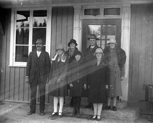 Bildtext: Ledamöter i Enångers kommunalfullmäktige samlade inför årets första möte 1919. Bakre raden f.v: Karl Broberg, Finnika, Algot Johansson, Bro, Olle Lindfors, Borka, Jonas Bergman, Bölan, Leon Östberg, Oppänge, Ernst Eriksson, Brofors, Otto Hendriksson, Bölan, Karl Sundström, Tosätter, Otto Nilsson, Oppänge, Ivar Hultman, Grängsjö. Främre raden från vänster: Per Settlin, Tosätter, Erik Gustavsson, Hålsänge, AW Ståby, Hökberg, LJ Enkvist, Haga, Jonas Andersson, Änga, Adolf Wallström, Fläcka, Anders Andersson, Hökberg, Henrik Winlöv, Bölan, Andreas Åker, Vedmora, Sven Gerdin, Svedja, PA Persson, Ådalen, Svante Svensson, Sätra, OW Enbom, Haga. Bilden fanns publicerad i Hudiksvallstidningen den 30/10 1990, varifrån namnuppgifterna är hämtade. Platsen är gården kallad Björkliden, senare Holms. Byggnaden torde ha inrymt café vid denna tid.