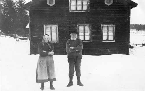 Bildtext: Wilhelm och Anna Westlings Tosätter. På gårdsplan står; Holger Hammarström fosterson till Lina Lindblom Storrbro, Gösta Westling, Gösta Vingren fosterson till Per Sättlin i Tosätter, Bertil Westling bror med Gösta, båda söner till Wilhelm och Anna Westling.