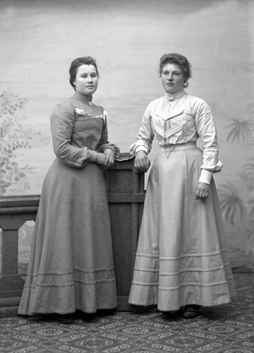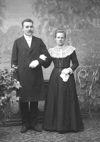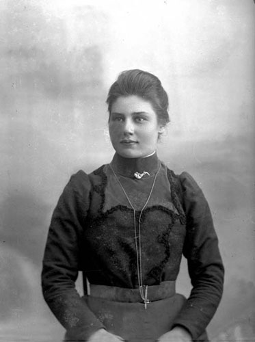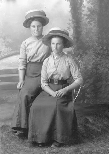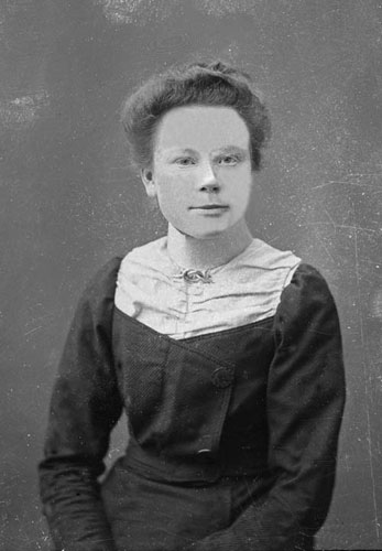 Bildtext: okänt kort, sannolikt söndagsskola, ledtråd: adresserat till Anna Andersson Rössånger. Damen uppe till vänster är Signe Nordin, mannen överst i mitten kan vara en av frikyrkopredikanterna knuten till Elim-kapellet i Enånger. Kvinnan nummer två från höger i den bakersta raden är Berna Andersson, dotter till Sånkmo-Bernard. Byggnaden i bakgrunden är sannolikt det tidigaste Elim-kapellet.
