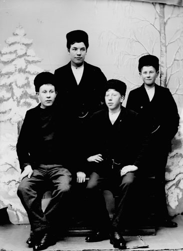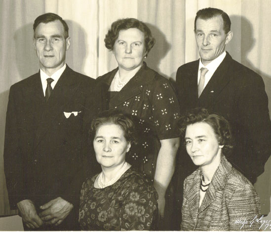 Bildtext: Anna, Arvid och Carin Thorén (f 1922), samt Carins kamrat Greta Olsson, Rosendal framför deras hus vis Södertjärn (Sörtjärn) Byatillhörigheten lär vara Hökberg. (Greta blev gift med Gustav Paulsson från Hökberg)