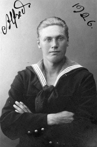Bildtext: Gruppbild framför ett hus. Eric Lundblad i mitten längst fram, Till vänster om honom Einar Fahlström, noterad som förvaltare från Boda bruk, f 1879. Övriga okända. Kan vara jaktkamrater eller personer med kommunala uppdrag i Enånger. En bildsynpunkt säger att huset är mycket likt gästgivaregården i Nyåker. P A Borin var fjärdingsman där, dock osäkert om han är med på bilden. Ytterligare en bildsynpunkt meddelat: Huset är gästgivaregården i Nyåker, soffan som man ser vid fönstret finns fortfarande kvar, fönstren gjordes om på 1970-talet. Ytterligare komplettering: Mannen till höger i dörröppningen är Emil Hansson Tosätter sub 4. Stående utanför bron är Anshelm Lindblom Tosätter.