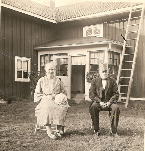 Bildtext: arbetslag fotograferat i samband med brädfodring av prästgården i Enånger. Överst fv: Gustav Forsberg, Johan Enström, okänd, Erik Persson, okänd, okänd från Bölan, okänd. Nedre rad: Ville Burman, okänd, Ville Borin, okänd