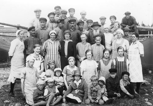 Bildtext: gruppbild från Våtnäs fiskeläge, fiskarbefolkningen. Följande namn finns noterade: Karl Bergkvist 3K10, Per Nordin 11L16, Erik Bergkvist 3K10, (okänd), Anders Johan Bergström, Vilhelm Olsson 5L20, Gunnar Norling 3R27, Anselm Gustavsson, Anders Olov Norling 3R27, Ida Norling 3R27, Adolf Jonsson 6B18, Greta Norling 3R27, Erik Olov Norling 3R27, Vilhelm Bergkvist 3K10, Per Johan Jonsson 6B17, Nils Erik Bergkvist 3K10, Adolf Nordin (X31), Johan Gustavsson (Janne) 12E7, Ingrid Gustavsson, Emelie Nordin, (okänd), Elvira Högblom 15D29, Ester Bergkvist 3K10, (okänd), Edit Jonsson 6B17, Erika Bergkvist 3K10, Ingrid (Inga) Gustavsson 12E7, Emmy Nordin 11L10, Agda Jonsson 6B18, Arne Jonsson 6B18, (okänd), Karin Bergkvist (3K10)11L10, Elin Gustavsson 12E14, Linnea Dahlbom 11L10 *), Erik Nordin 11L16, Elsa Nordin 11L16, (okänd), Gösta Högblom 15D29, Gunnel Högblom 15D29, Albin Jonsson 6B17, Sven Nordin. *) som skänkte Bro-gård i Njutånger till EFS.