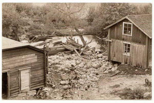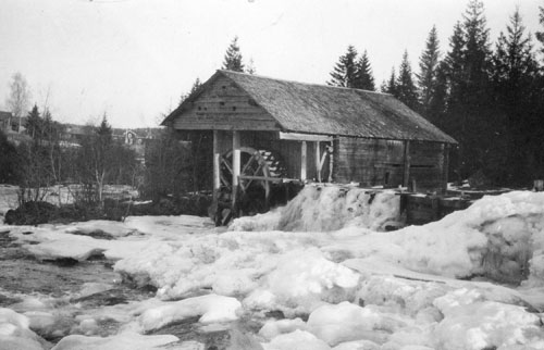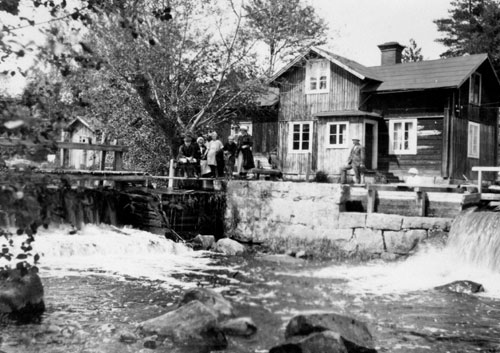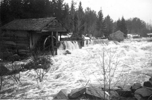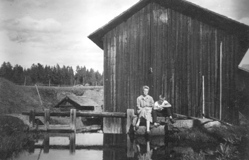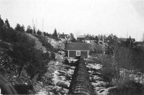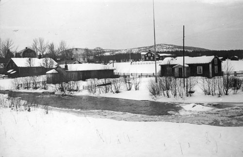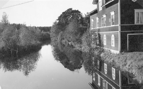 Bildtext: Sjöbod i "Packerslaven" (Packalavan). (Enångersåns utlopp mot havet, den tidigare hamnanläggningen i Enånger) Bilden tagen från öster, där några gårdar i Holmen skymtar till höger, notera Enångers Kyrka i vänster kant. Denna sjöbod låg ca 300m nedströms Packerslaven och tillhörde Norins i Haga. Senaste ägare var Erik Norin som rev den i slutet av 60-talet, då den var alltför dålig att reparera. Kompletterande bildupplysning: Båten är Ludvig Enströms. Tidigare låg en sjöbod 50 meter väster om denna som tillhörde Rå i Haga,den syns på andra, tidigare kort